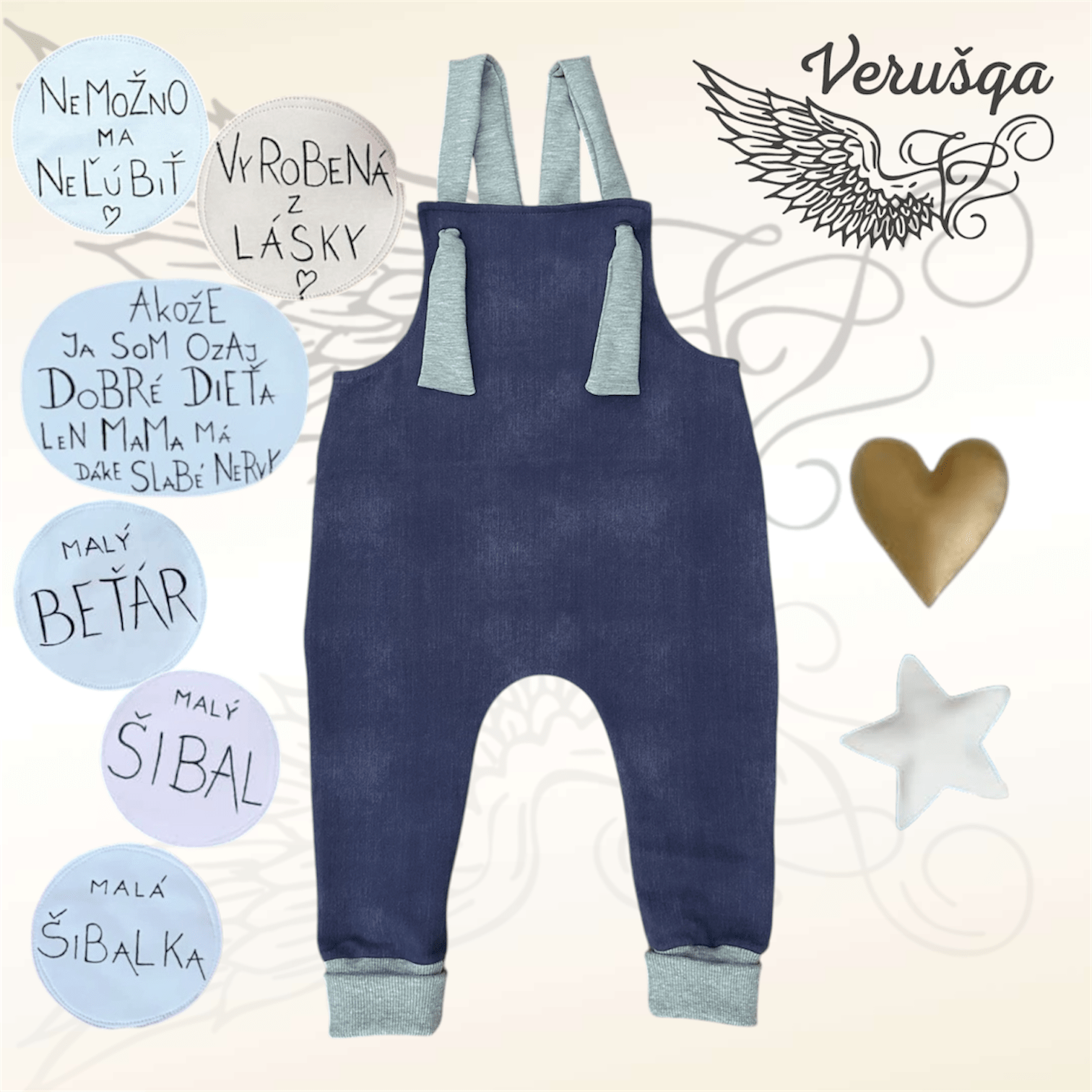 Krásne rastúce a pískajúce nohavice na traky prestrihnuté s rôznymi farbami látok. Sú vyrábané ako dvojčíslo, avšak ich veľkou výhodou je, že vydržia častokrát aj 3 veľkosti. Majú rastúce patenty na nohách a elastické traky na uzlík, ktoré si prispôsobíte podľa potreby. Sú vyrobené z veľmi príjemného materiálu.