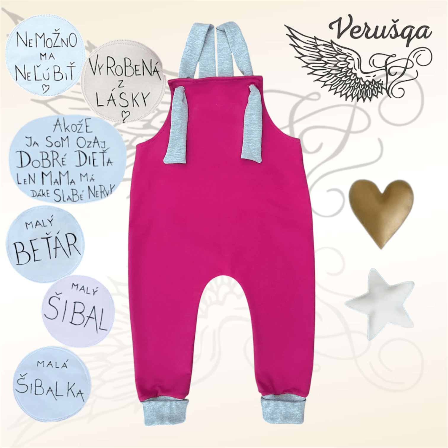 Krásne rastúce a pískajúce trakáče prestrihnuté s rôznymi farbami látok. Sú vyrábané ako dvojčíslo, avšak ich veľkou výhodou je, že vydržia častokrát aj 3 veľkosti. Majú rastúce patenty na nohách a elastické traky na uzlík, ktoré si prispôsobíte podľa potreby. Sú vyrobené z veľmi príjemného materiálu.