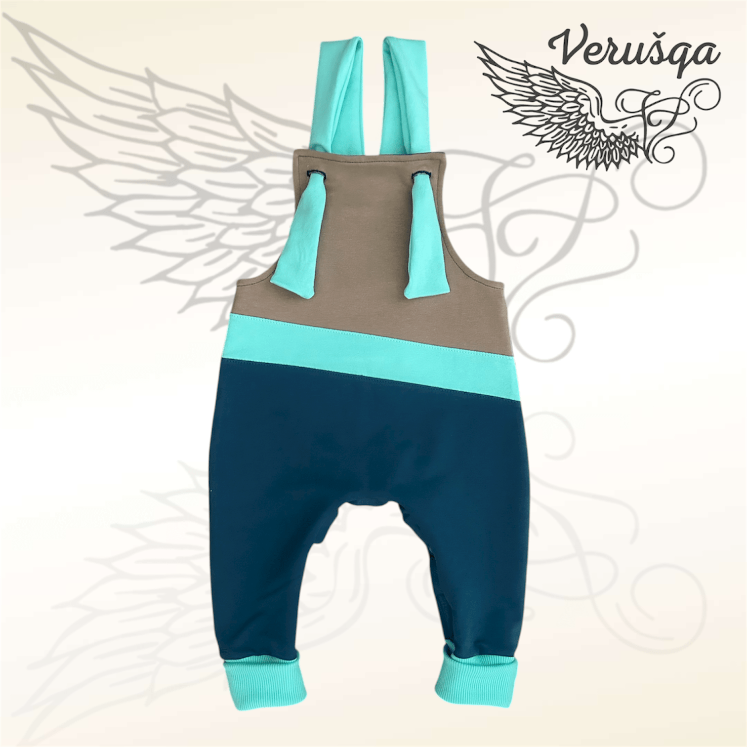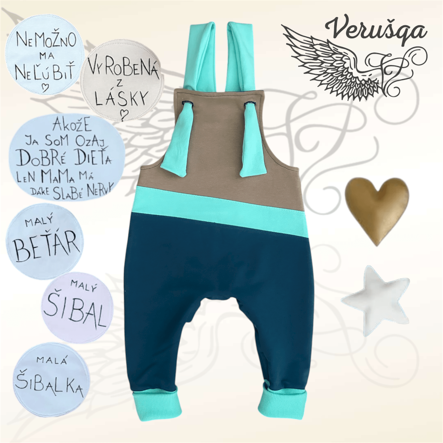 Krásne rastúce a pískajúce nohavice na traky prestrihnuté s rôznymi farbami látok. Sú vyrábané ako dvojčíslo, avšak ich veľkou výhodou je, že vydržia častokrát aj 3 veľkosti. Majú rastúce patenty na nohách a elastické traky na uzlík, ktoré si prispôsobíte podľa potreby. Sú vyrobené z veľmi príjemného materiálu.