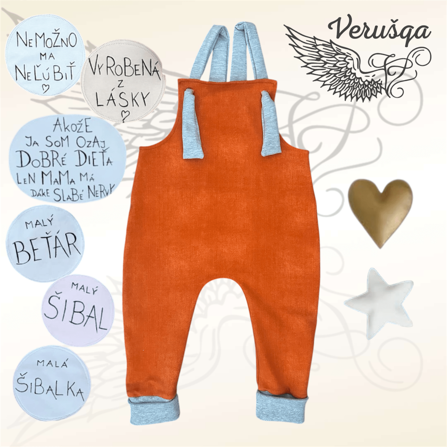 Krásne rastúce a pískajúce nohavice na traky prestrihnuté s rôznymi farbami látok. Sú vyrábané ako dvojčíslo, avšak ich veľkou výhodou je, že vydržia častokrát aj 3 veľkosti. Majú rastúce patenty na nohách a elastické traky na uzlík, ktoré si prispôsobíte podľa potreby. Sú vyrobené z veľmi príjemného materiálu.