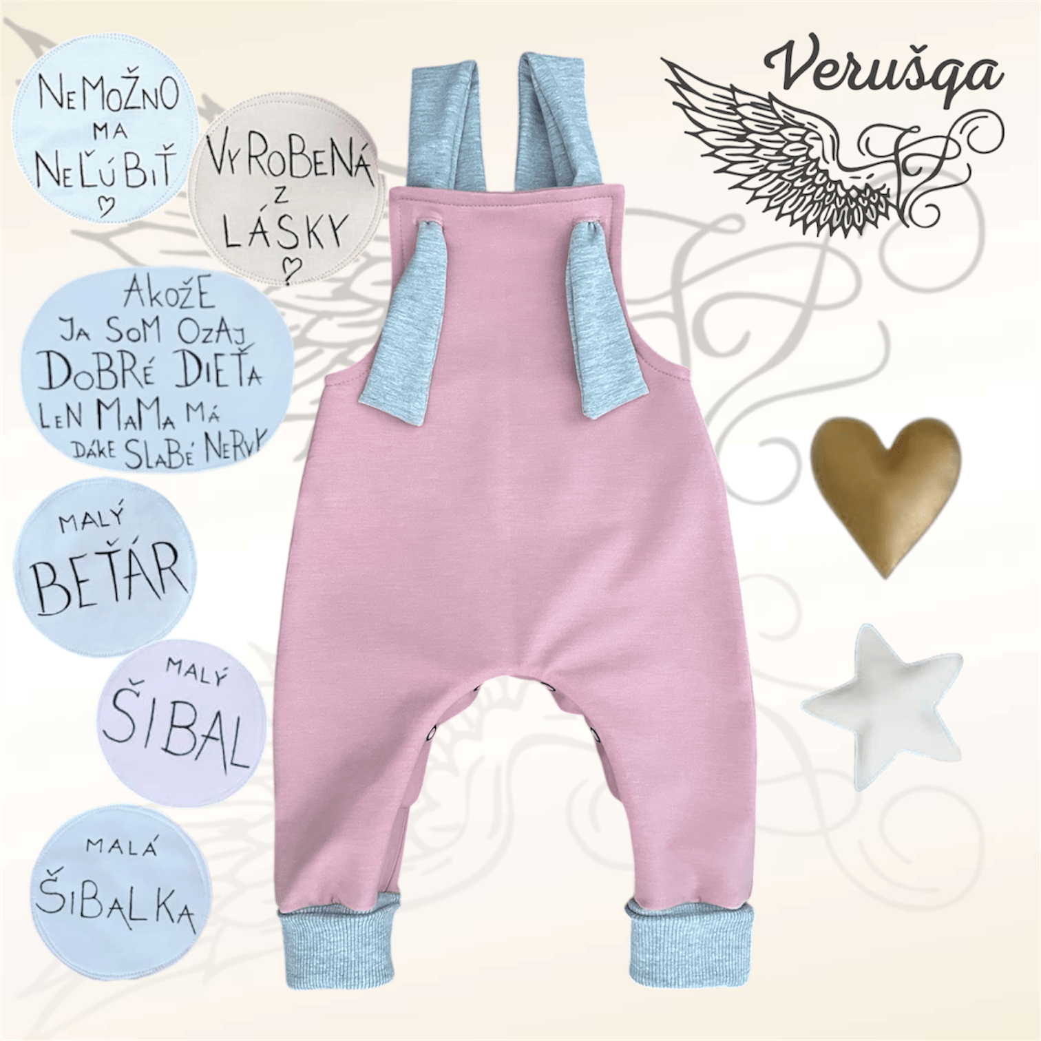Krásne rastúce a pískajúce nohavice na traky prestrihnuté s rôznymi farbami látok. Sú vyrábané ako dvojčíslo, avšak ich veľkou výhodou je, že vydržia častokrát aj 3 veľkosti. Majú rastúce patenty na nohách a elastické traky na uzlík, ktoré si prispôsobíte podľa potreby. Sú vyrobené z veľmi príjemného materiálu.